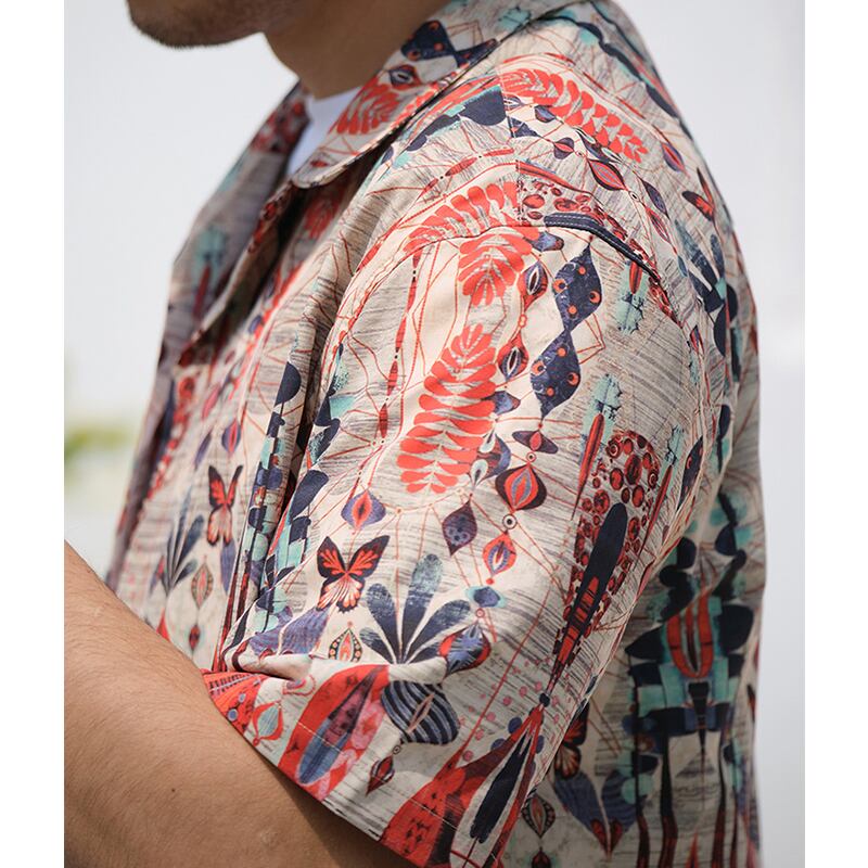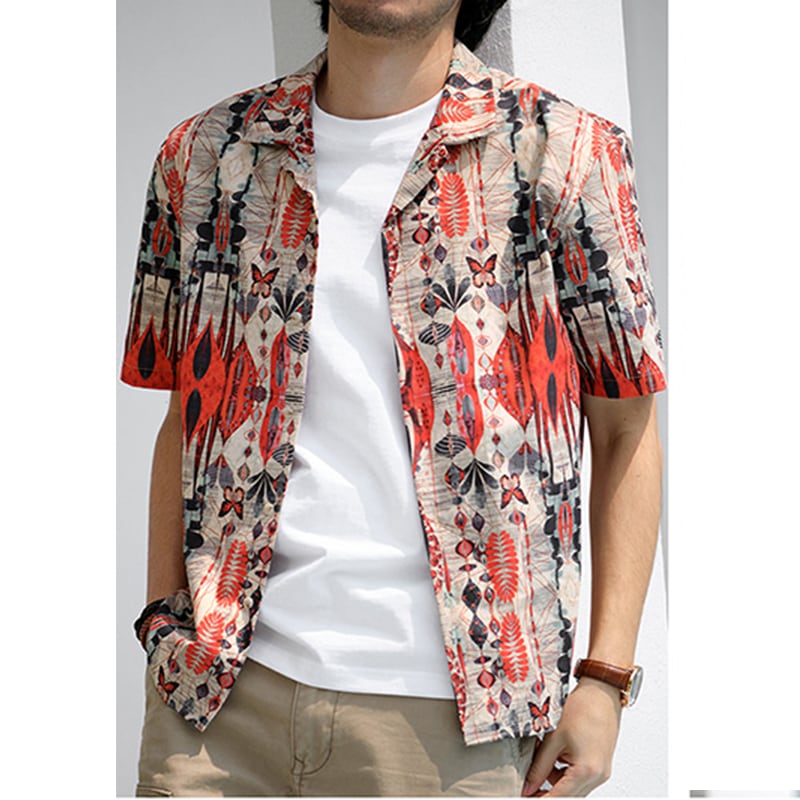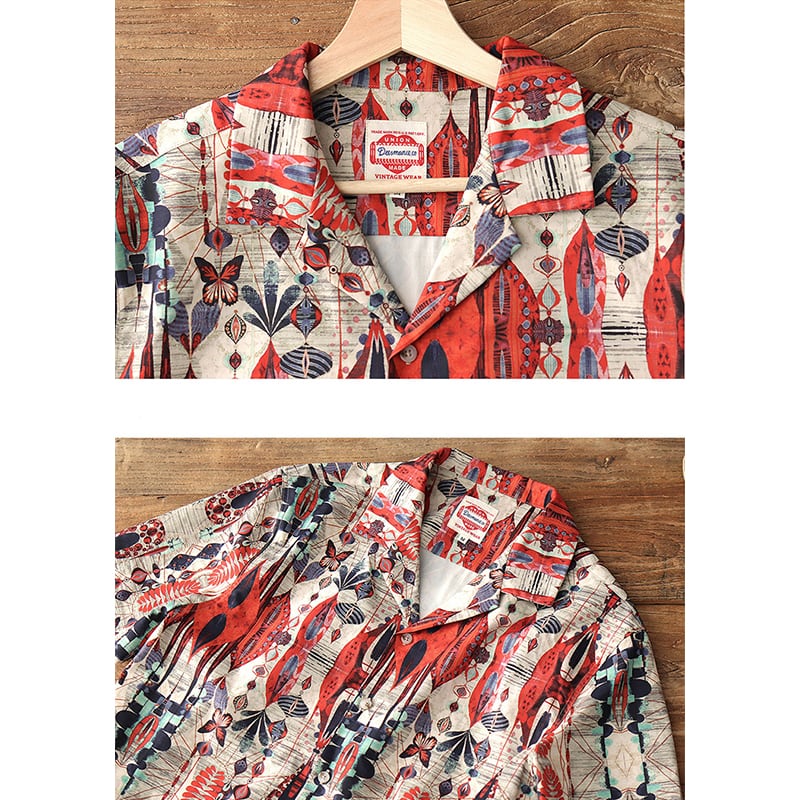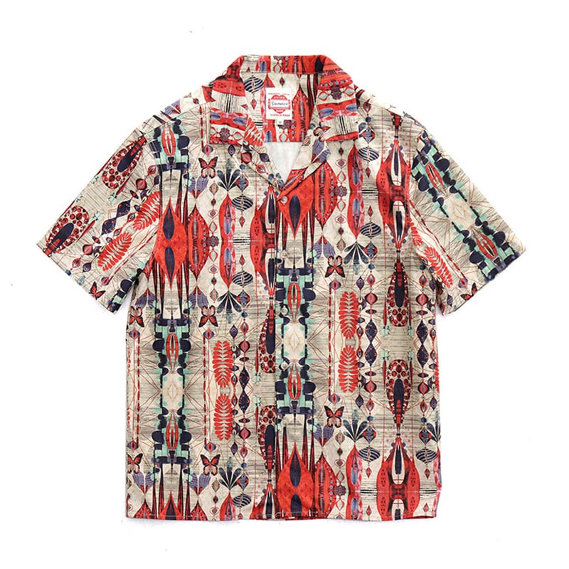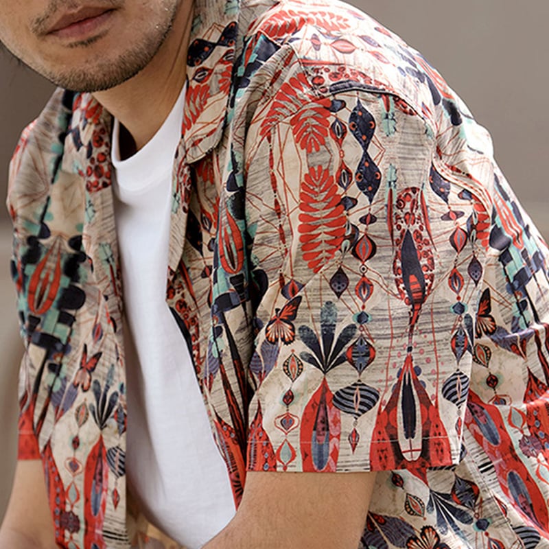 目を惹く自然モチーフの幾何学模様がヴィンテージ感のあるオープンカラーシャツ。