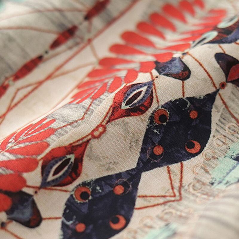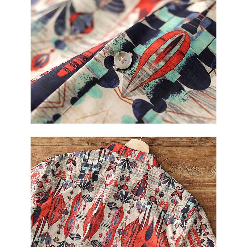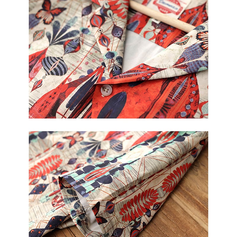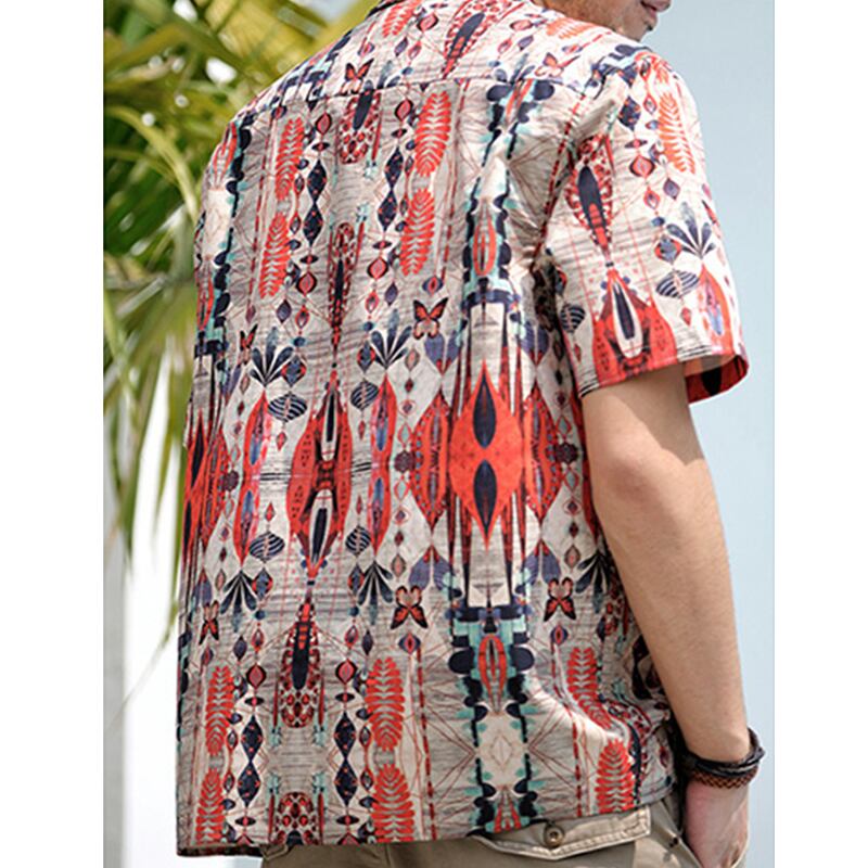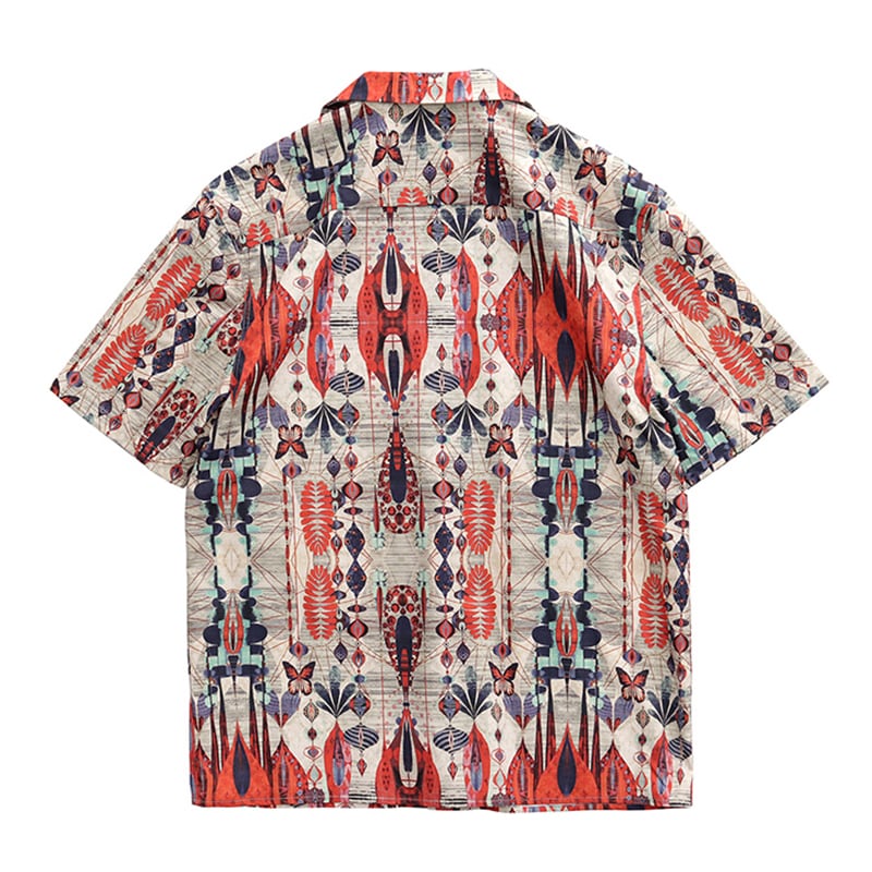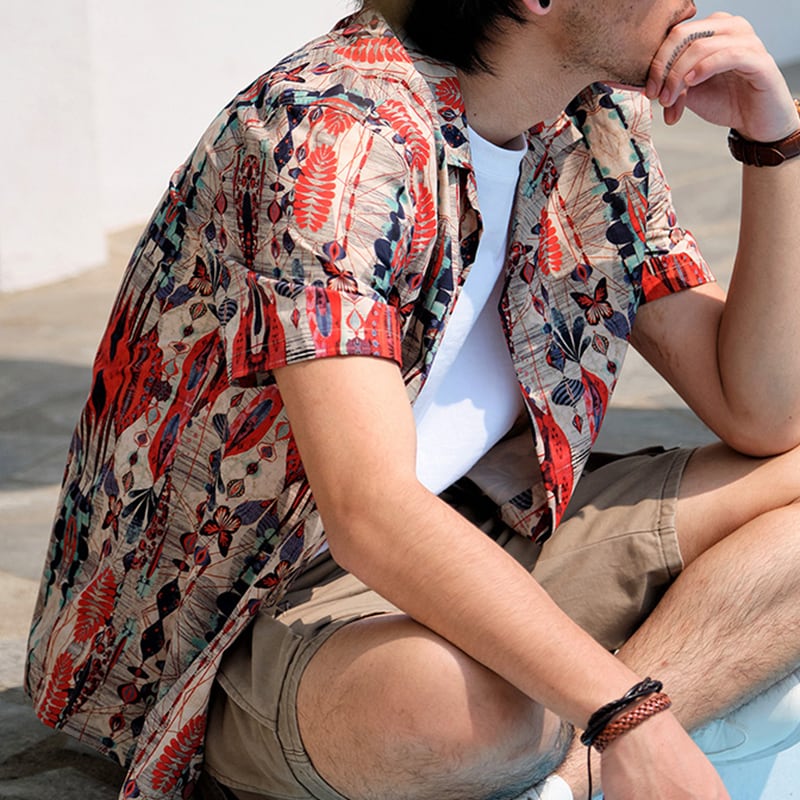 目を惹く自然モチーフの幾何学模様がヴィンテージ感のあるオープンカラーシャツ。