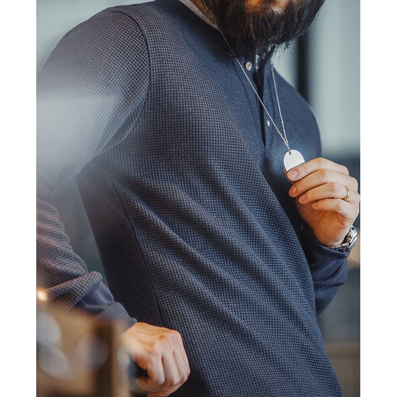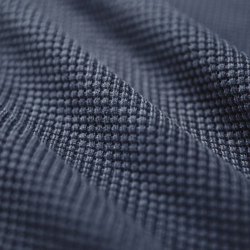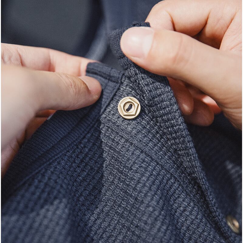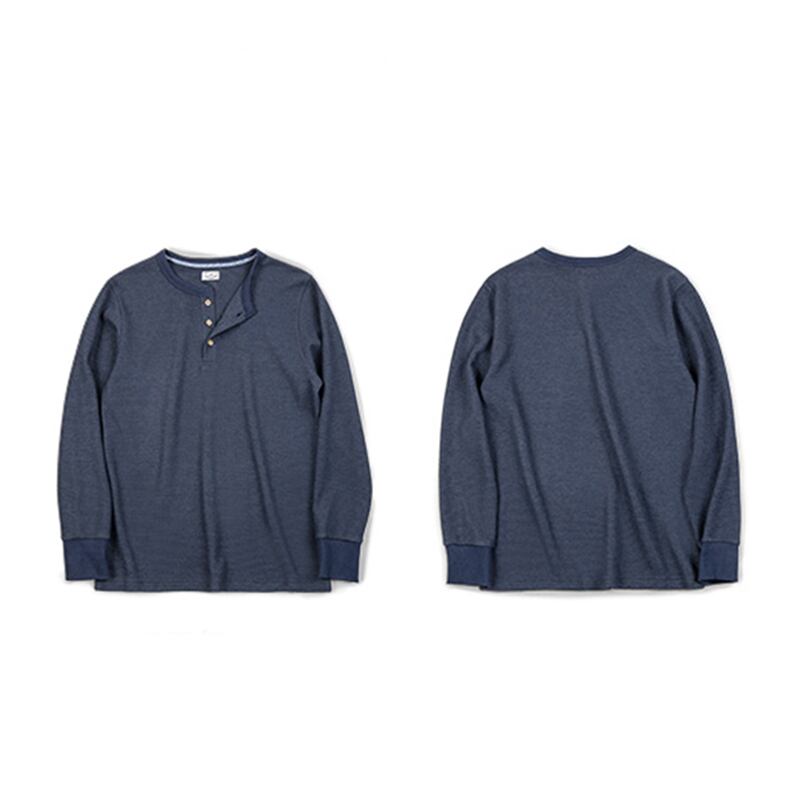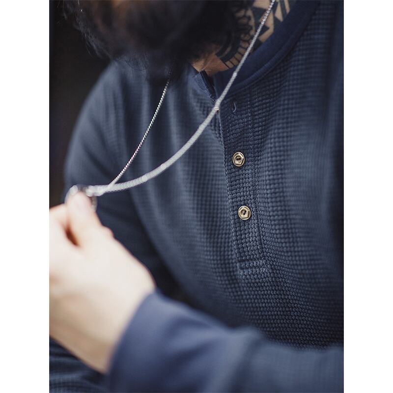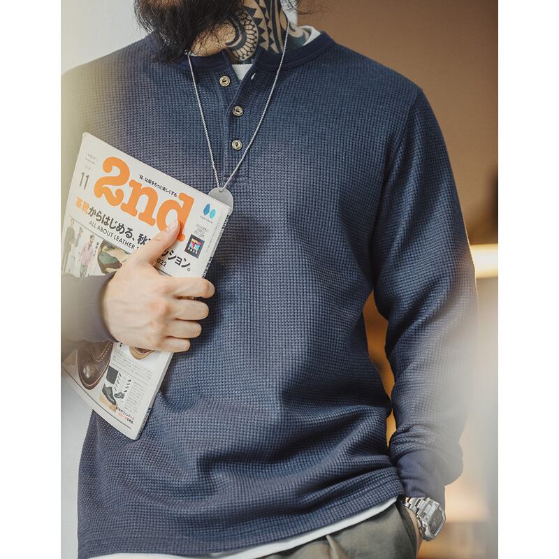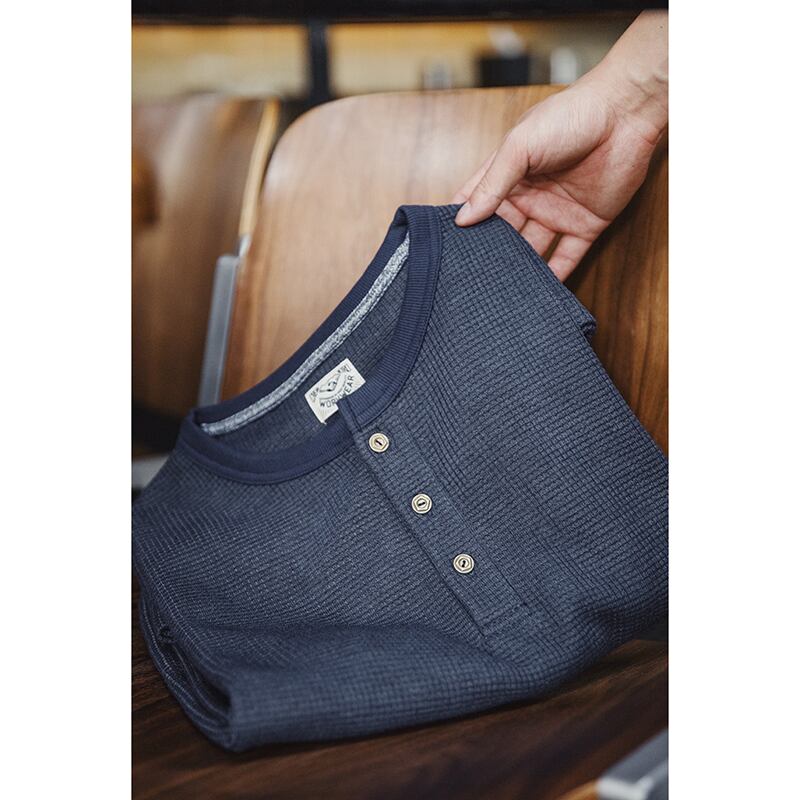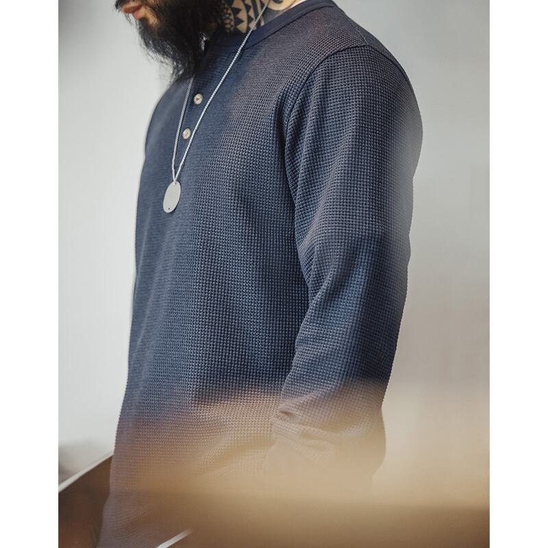 ワッフル生地のヘンリーネック長袖Tシャツ。