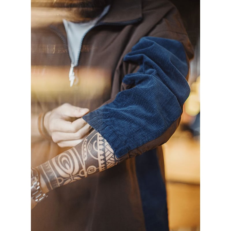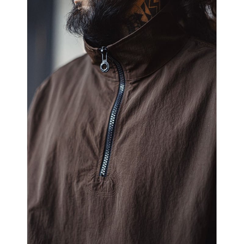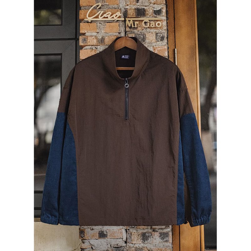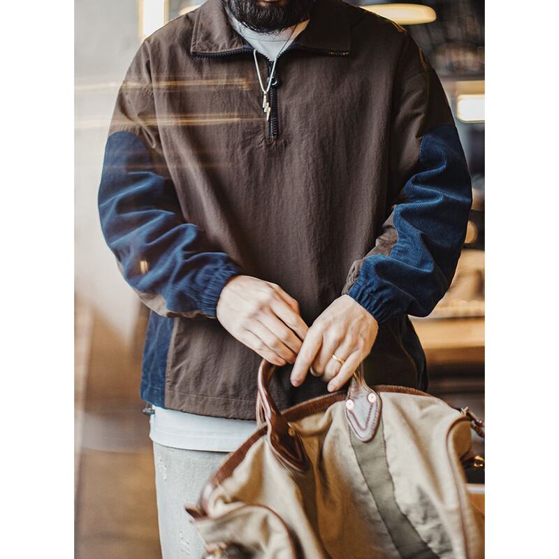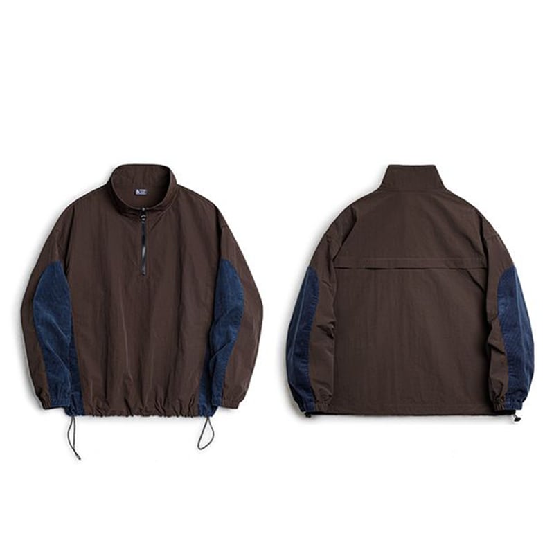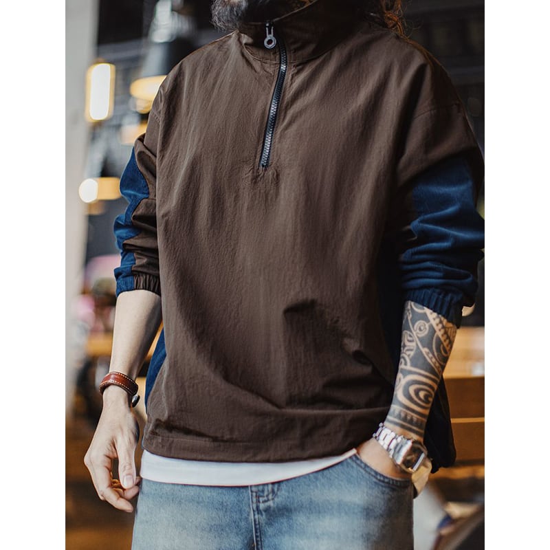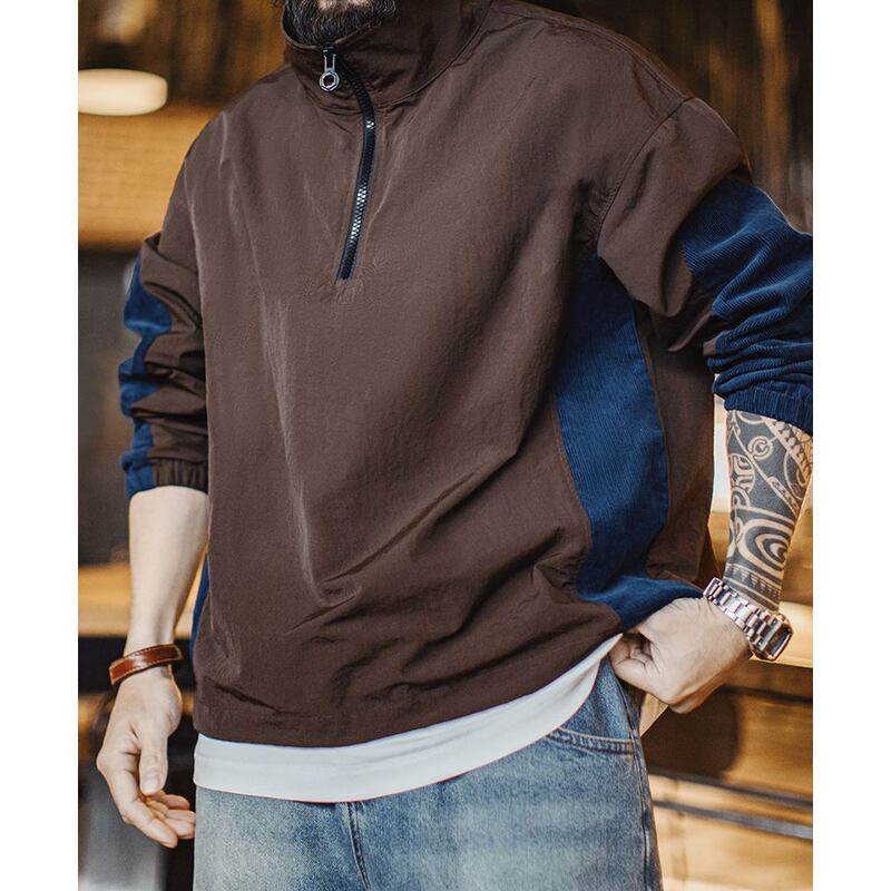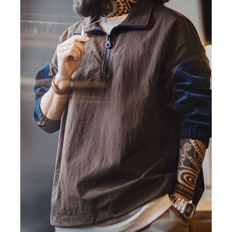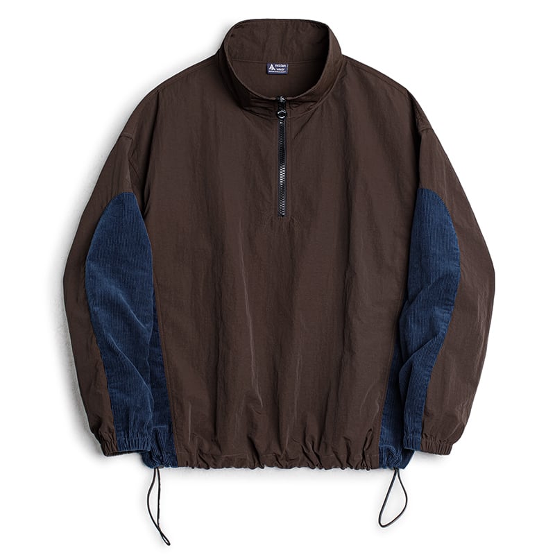 アームの一部を異素材でドッキングしたハーフジッププルオーバー。
