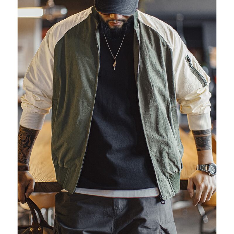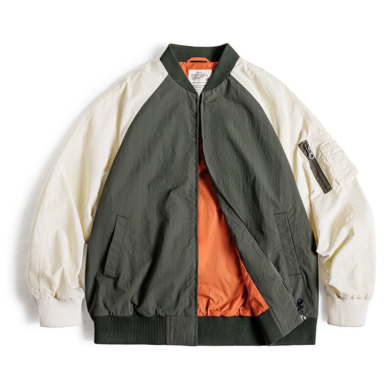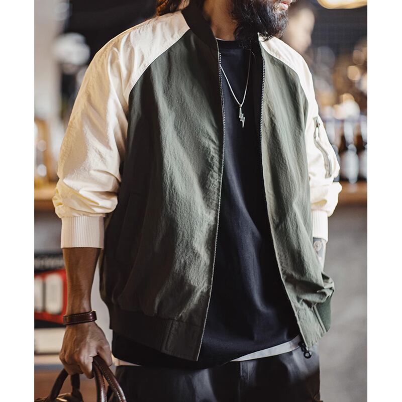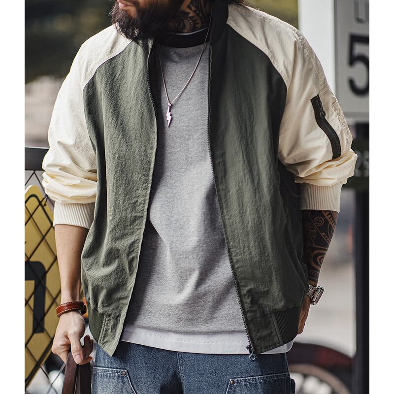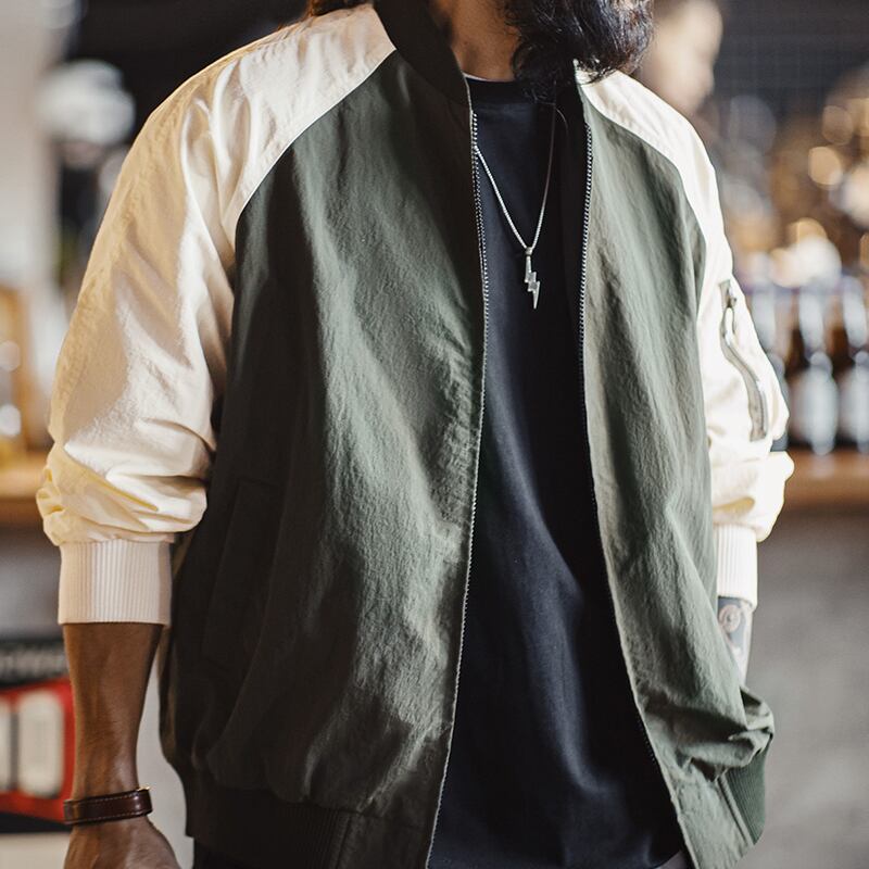 バイカラーデザインが目を惹くボンバージャケット。