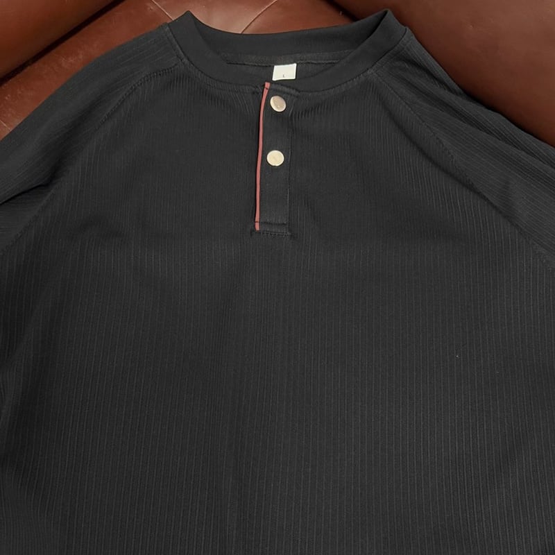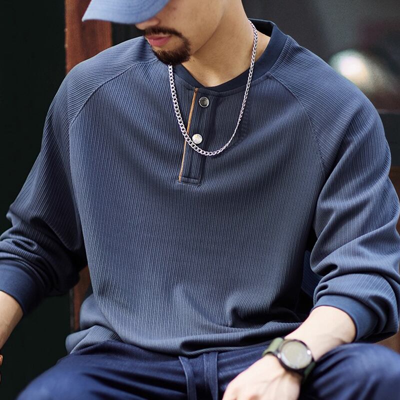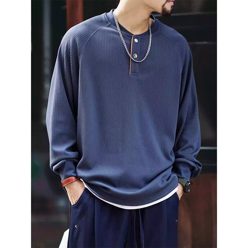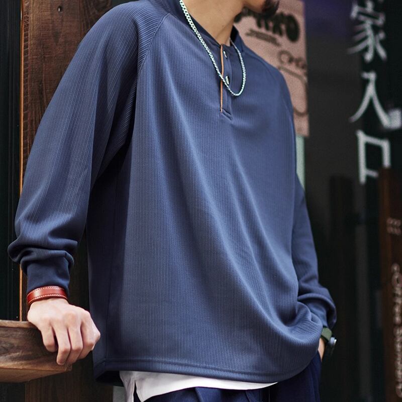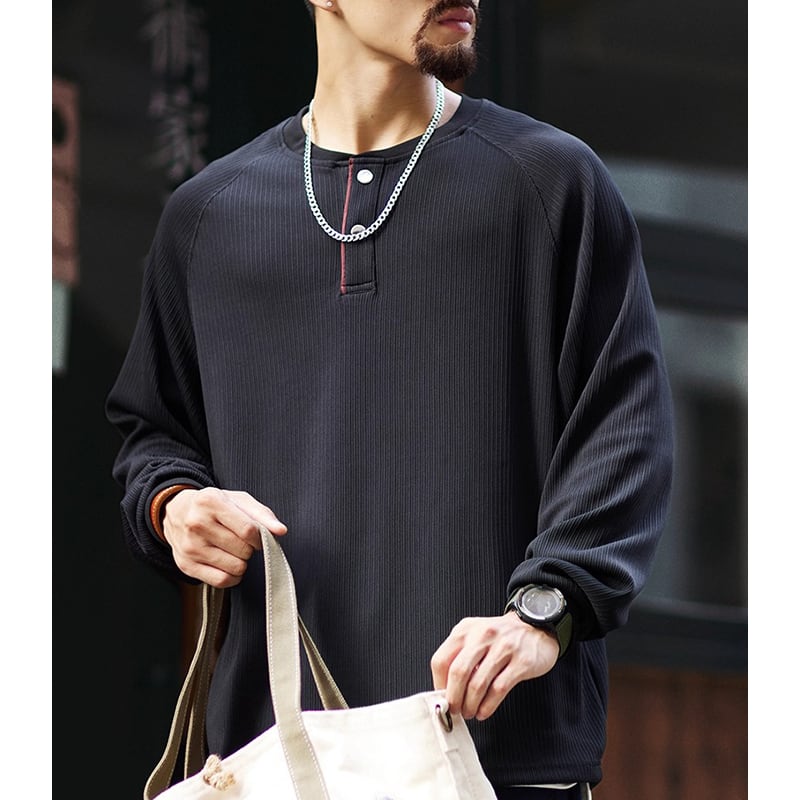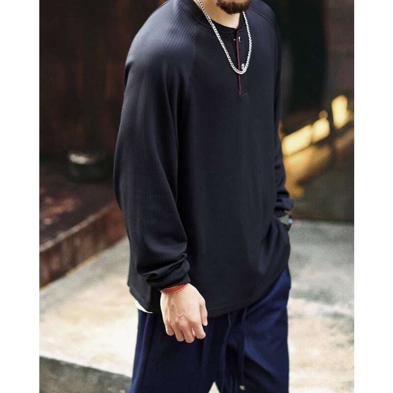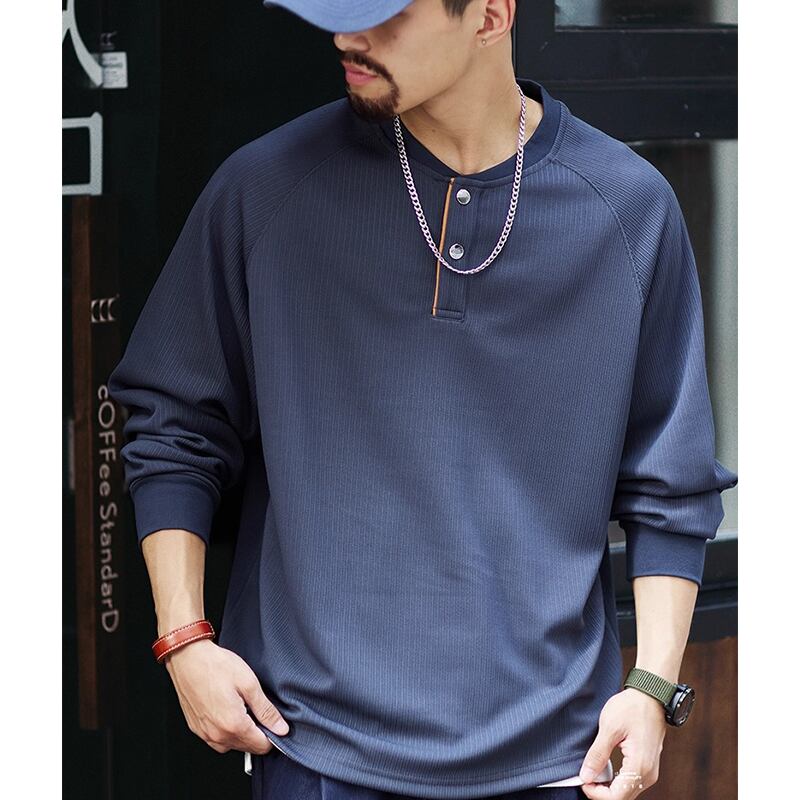 洗練された大人のための、ヘンリーネックラグランロングスリーブTシャツ。