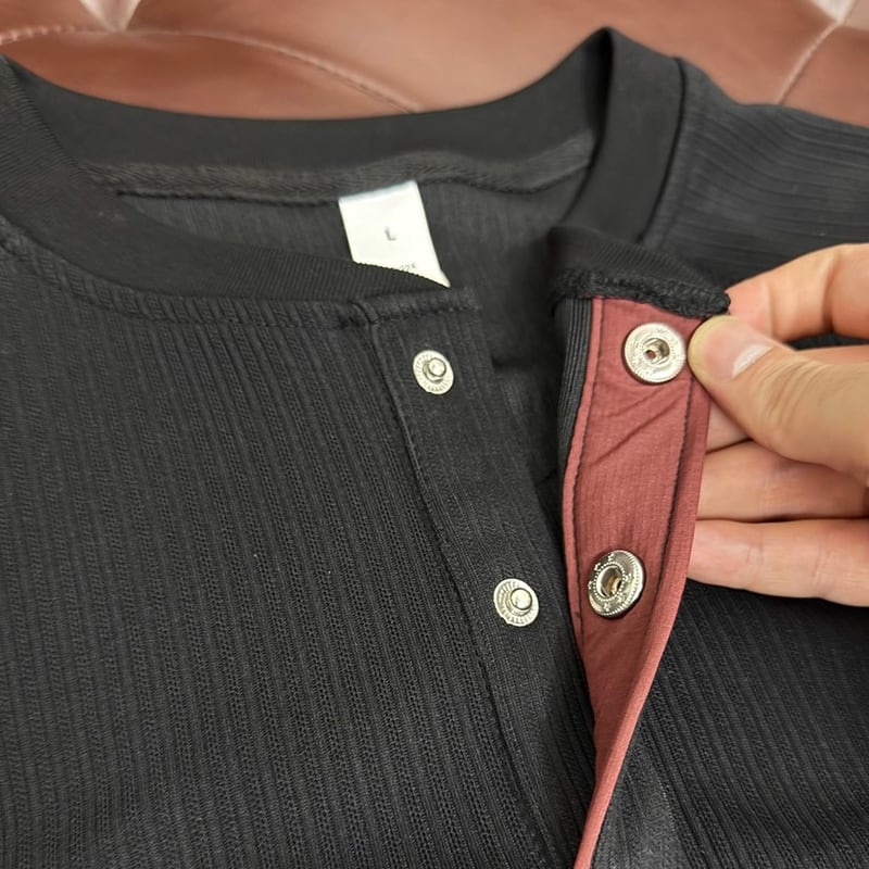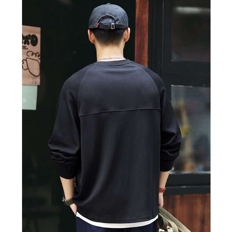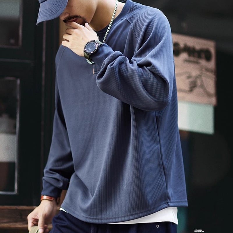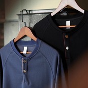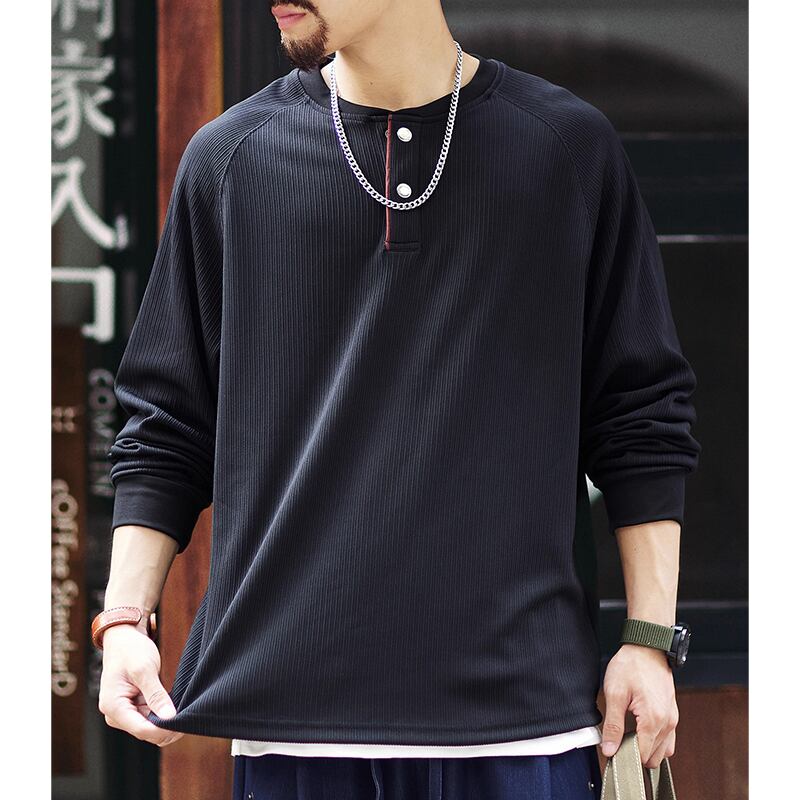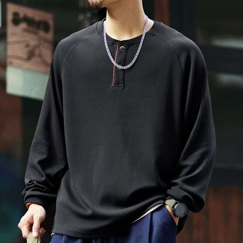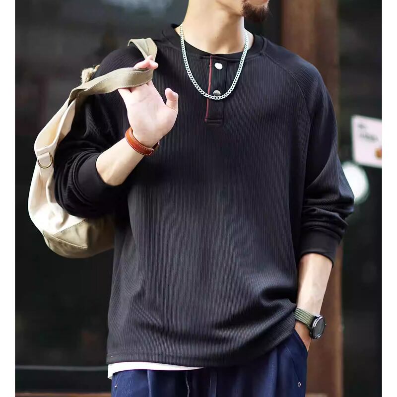 洗練された大人のための、ヘンリーネックラグランロングスリーブTシャツ。