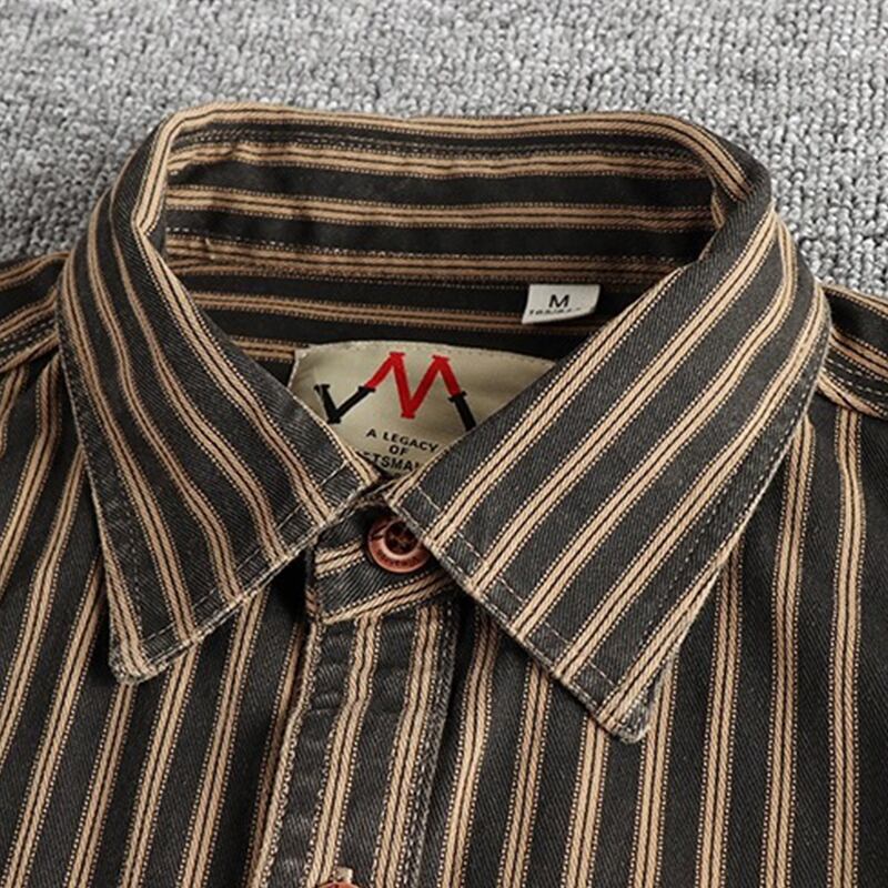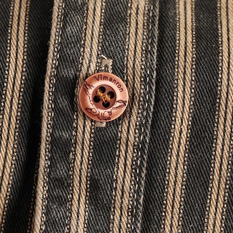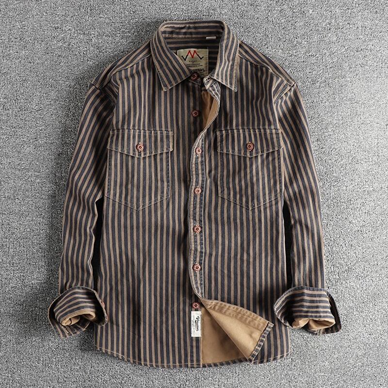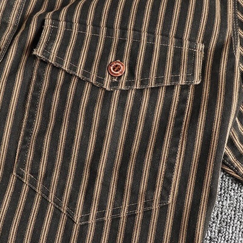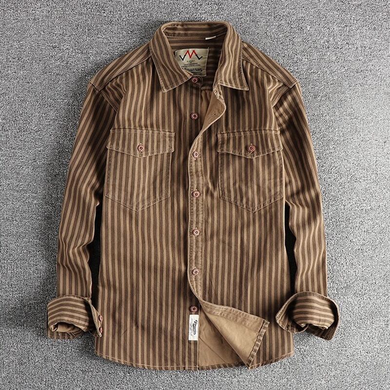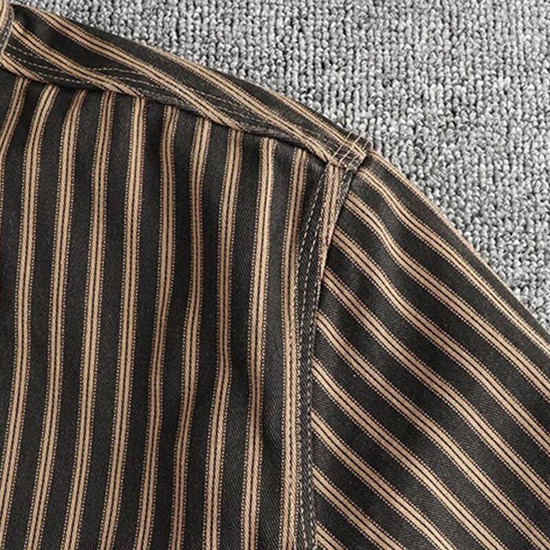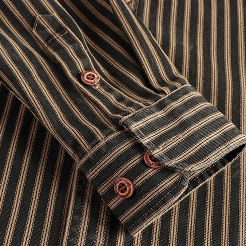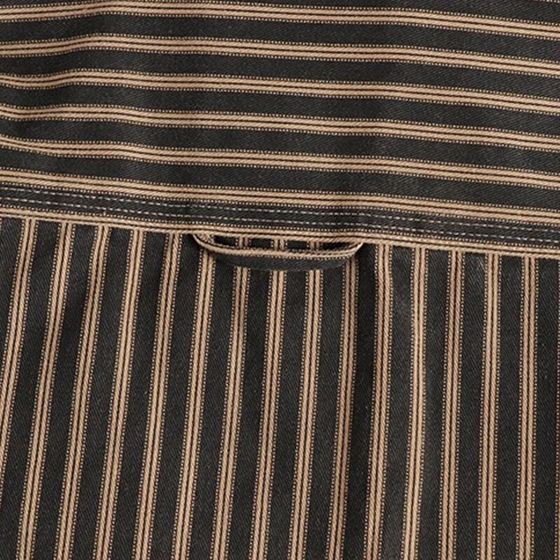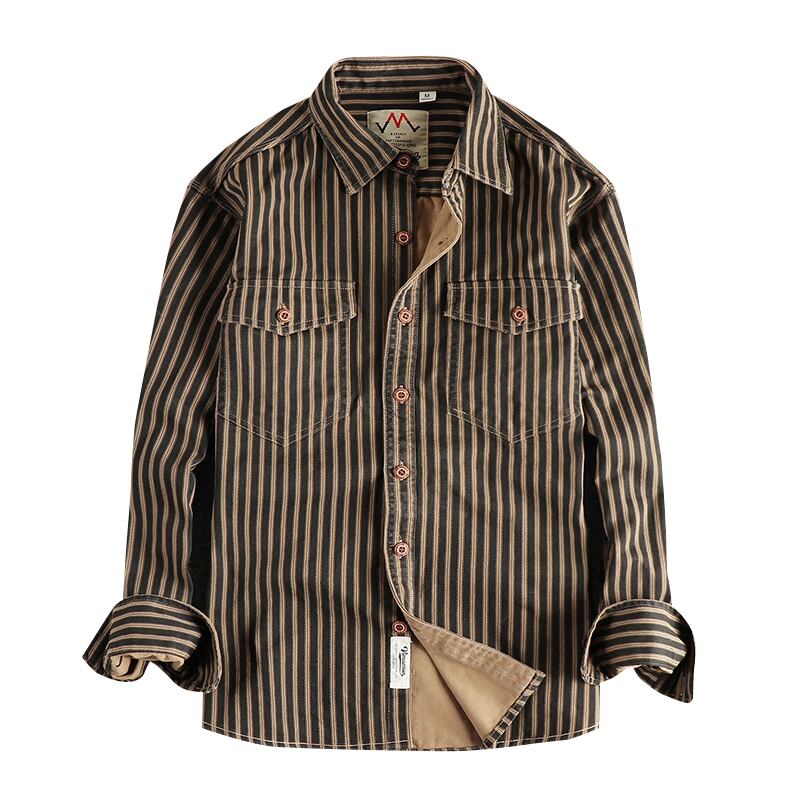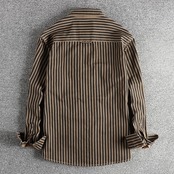 ベージュカラーをベースにしたストライプ柄が印象的な長袖シャツ。