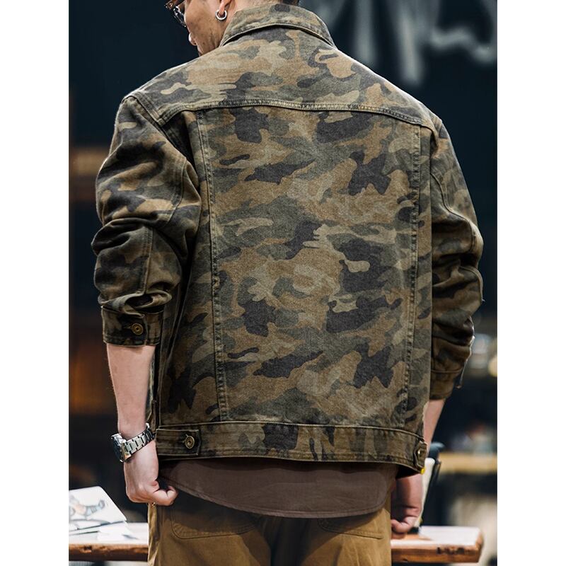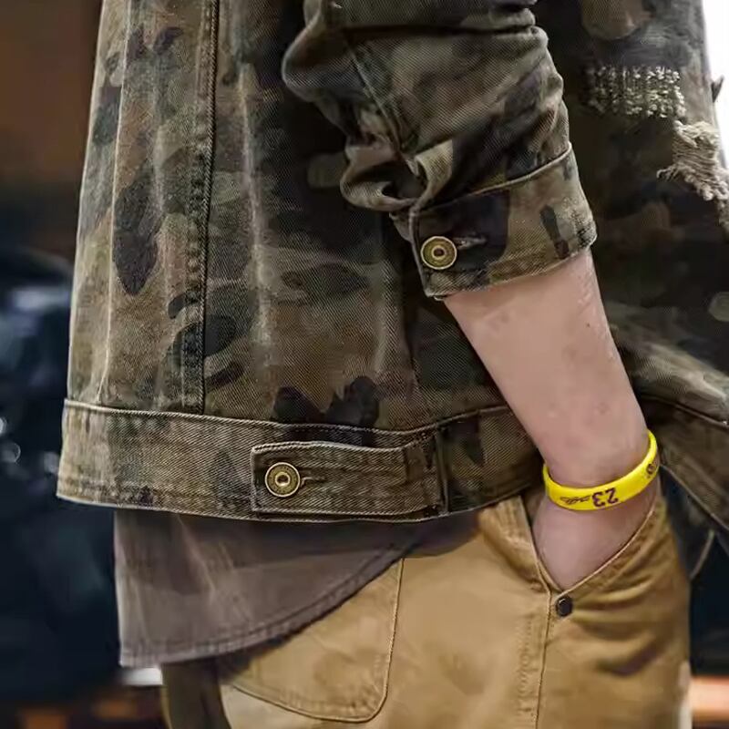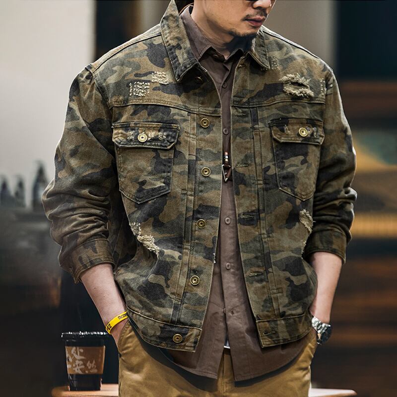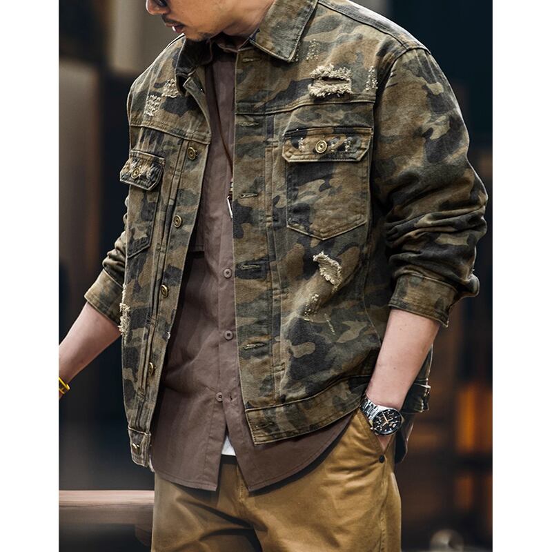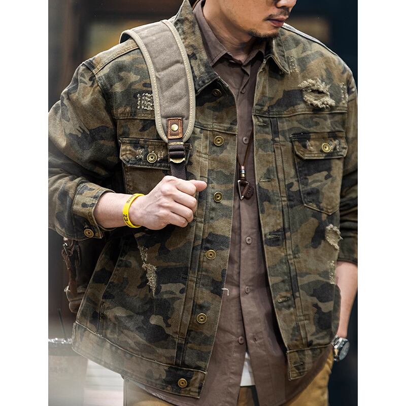 Distressed camouflage double flap denim jacket 00479