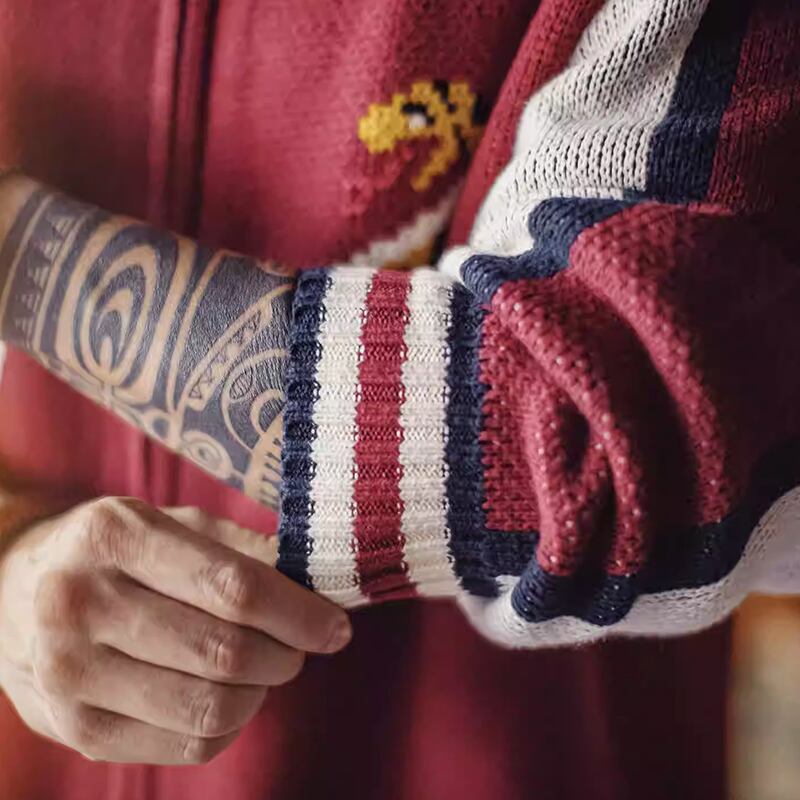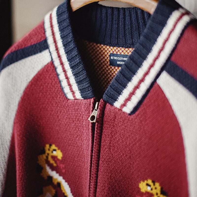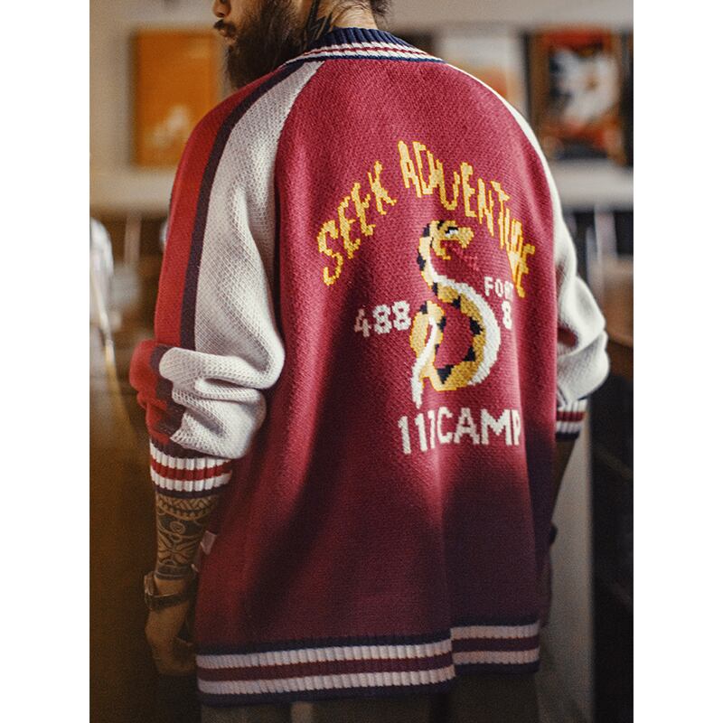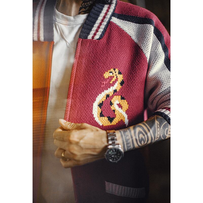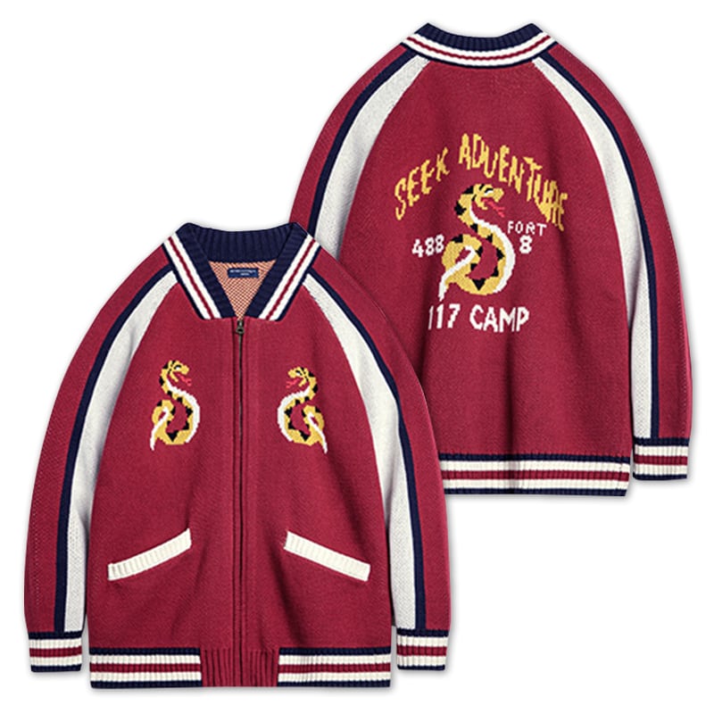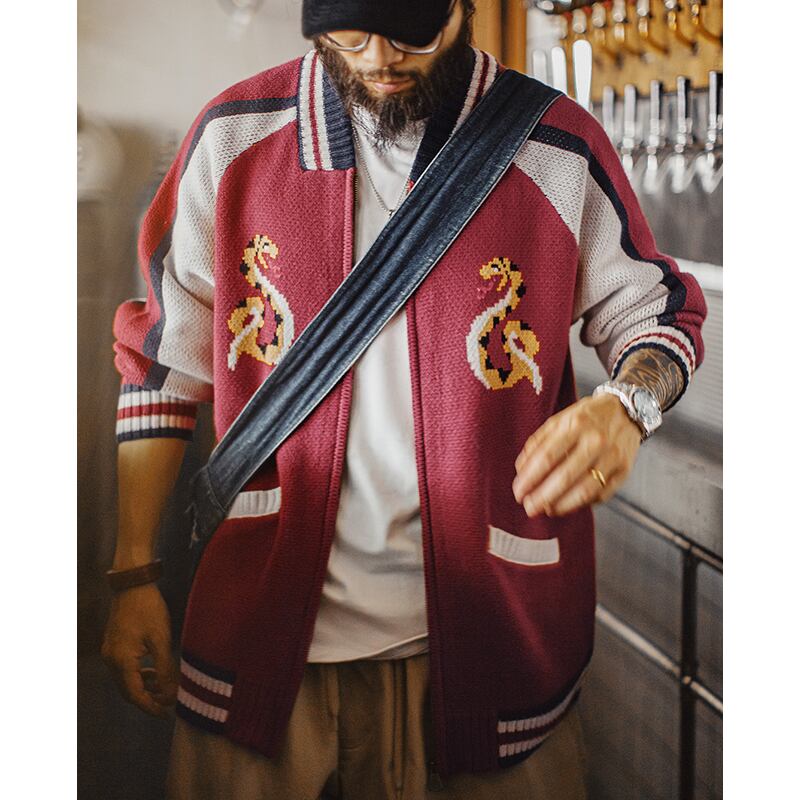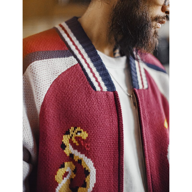 蛇デザインがユニークなスカジャンモチーフのニットカーディガン。