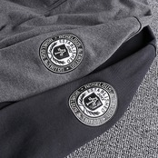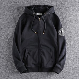 腕の刺繍ロゴデザインが特徴的なフルジップパーカー。
