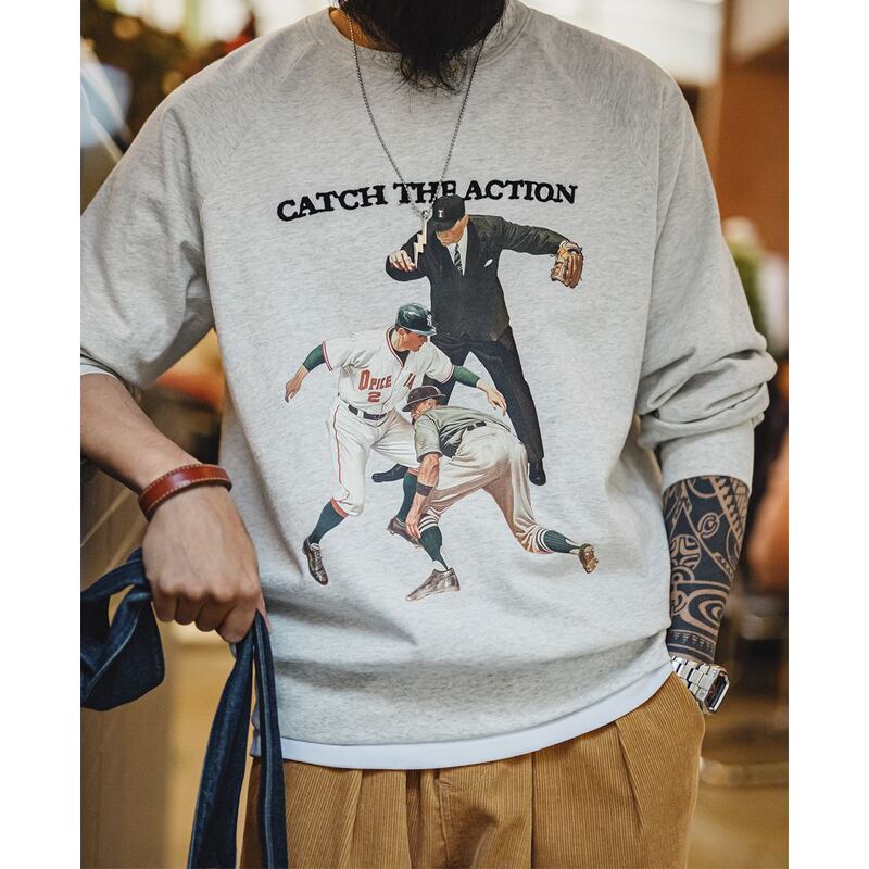 アメリカンヴィンテージ感のあるベースボールイラストが目を引くTシャツ。