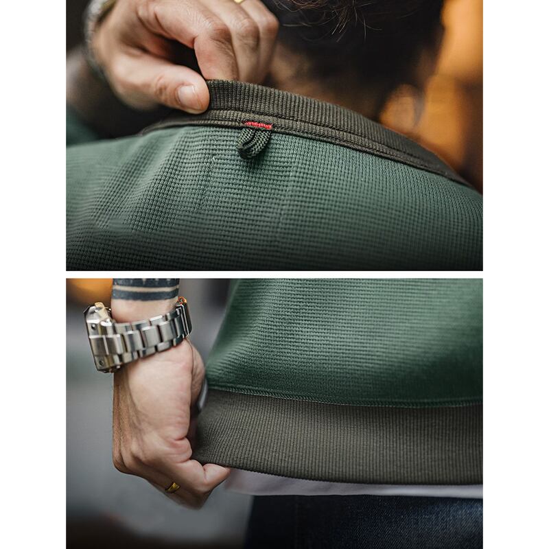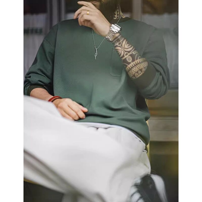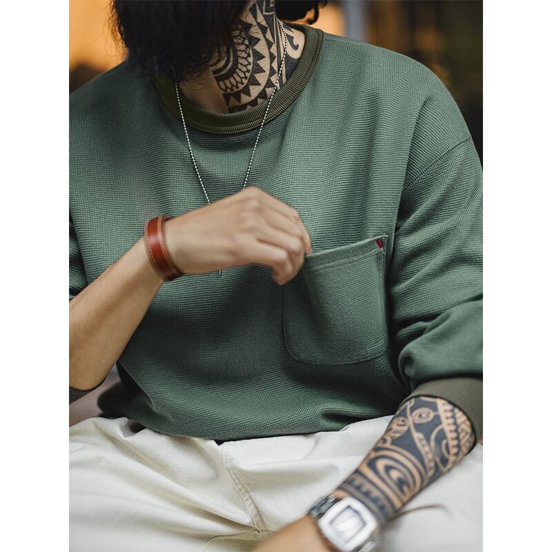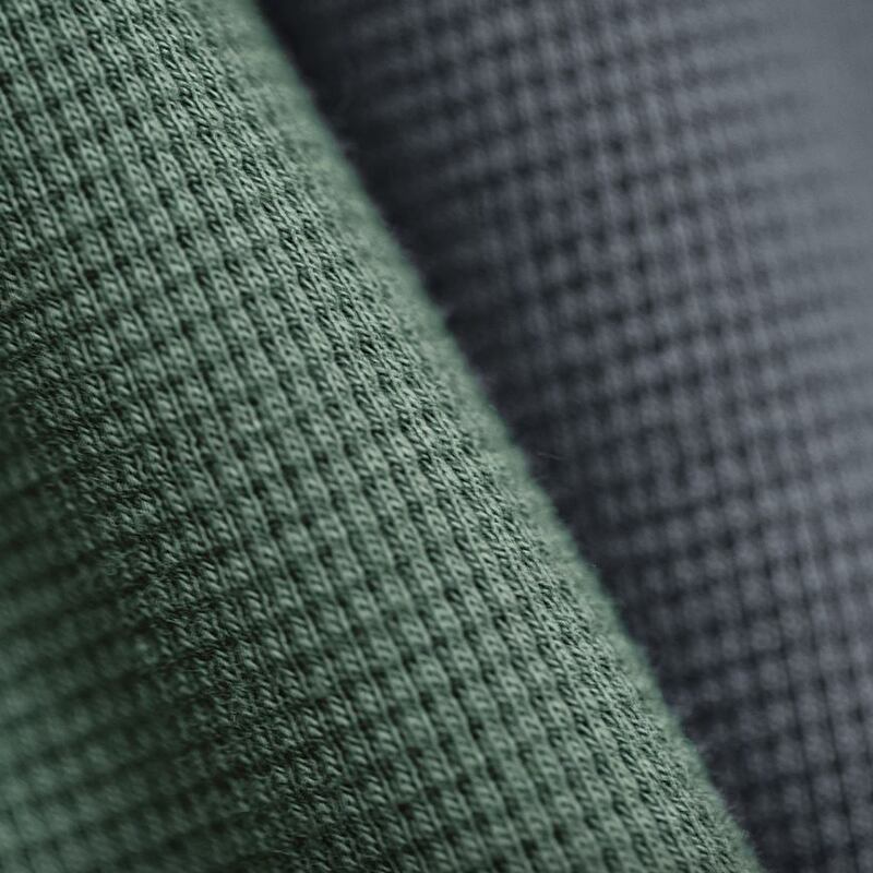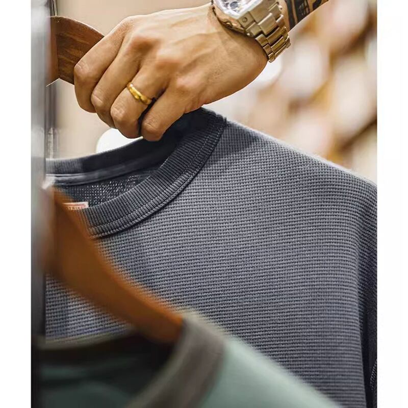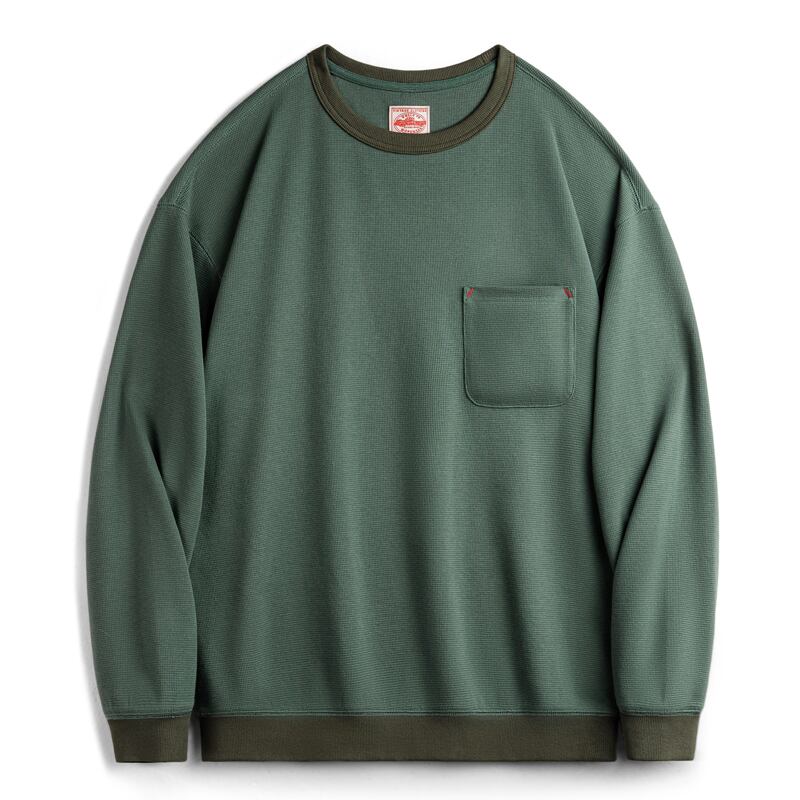 ワッフル生地のクルーネックロングスリーブTシャツ。