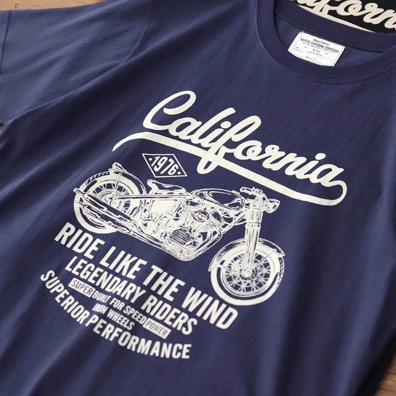 ヴィンテージ感あふれるモーターサイクルグラフィックがプリントされた、クルーネック半袖Tシャツ。